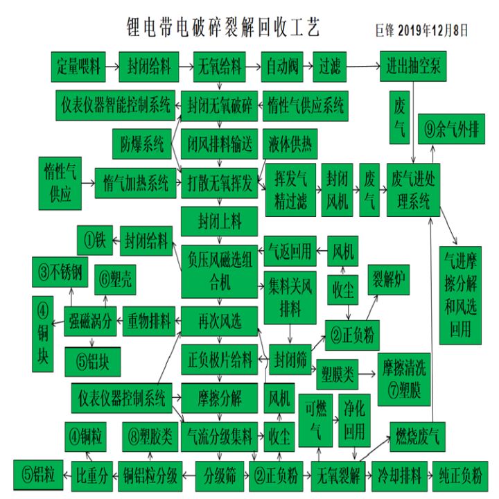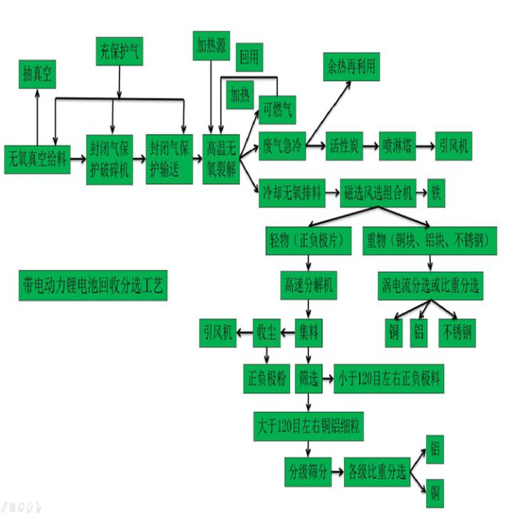 帶電鋰電池經(jīng)無氧給料進(jìn)保護(hù)氣體貧氧破碎設(shè)備,破碎后再經(jīng)貧氧條件下輸送至再無氧裂解爐系統(tǒng)中進(jìn)行裂解,帶電破碎物料在爐內(nèi)放電發(fā)熱電能再利用,高溫裂解電解質(zhì)、塑膜、塑膠和粘合劑裂解的可燃?xì)馀c破碎廢氣進(jìn)行燃燒,對(duì)爐進(jìn)行加熱,達(dá)到了電池綜合熱值利用,裂解物料經(jīng)磁選風(fēng)選機(jī)、金屬分選,把鐵、鋁塊、不銹鋼和銅塊分選出,極片料進(jìn)高速摩擦,裂解后極粉與銅鋁箔已無粘合力,在摩擦分離后經(jīng)過收集、篩選、比重分選、把極粉、銅和鋁進(jìn)行分離,燃燒尾氣經(jīng)處理(冷卻、收塵、噴淋、氣霧分離、吸附過濾、煙囪排放等)達(dá)標(biāo)外排(因在無氧條件下從而抑制二惡英等有害氣產(chǎn)生和氧化);經(jīng)過一系列的工序把鋰電池分為鐵、鋁塊、銅塊、不銹鋼、正負(fù)極粉、銅粒、鋁粒。