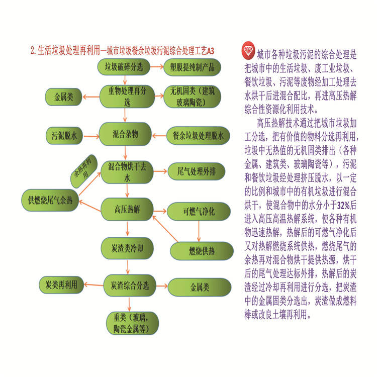 城市里各種垃圾污泥綜合處理是把城市中的生活垃圾、廢工業(yè)垃圾、餐飲垃圾、污泥等廢物經(jīng)加工處理去水烘干后進(jìn)混合配比,再進(jìn)高壓熱解綜合性資源化利技術(shù)。