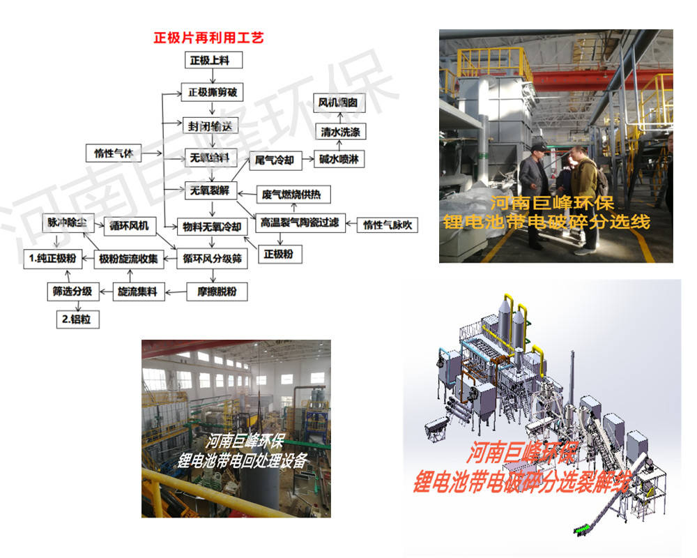 磷酸鐵鋰電池正極片廢料處理設(shè)備包括破碎系統(tǒng)、料倉給料系統(tǒng),高速摩擦脫粉設(shè)備,旋流氣流分級集料系統(tǒng),篩選機麻布袋除塵,引風機,軟體彈簧輸送,極粉封閉料倉,分離時間短,工作效率高,回收工藝簡單,成本低,活性物質(zhì)與集流體分離準確,雜質(zhì)含量低,活性物質(zhì)粒徑可控,具有經(jīng)濟價值和效益。